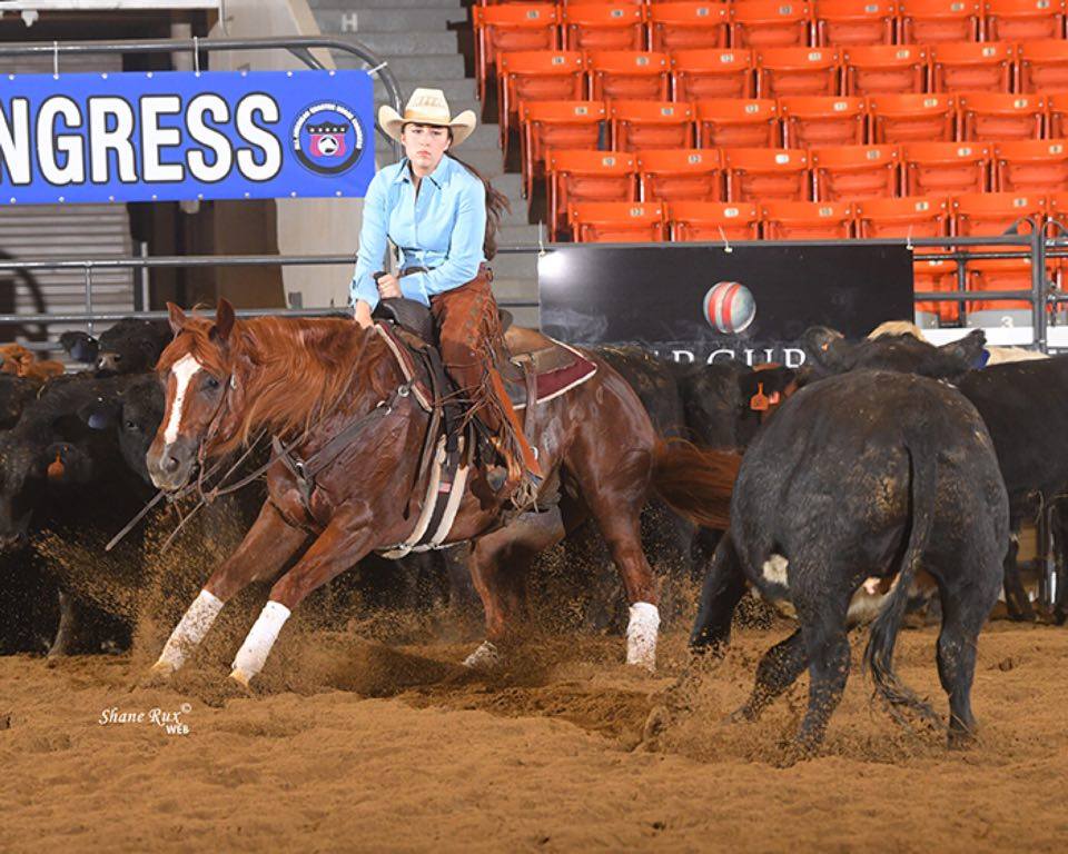 Alexis Stephas, of Chattanooga, Tenn., won the Open Bridleless Cutting on “Once You Go Black.” The two also took reserve in the NCHA $25,000 Novice Horse Non-Pro Cutting.